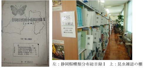 その後、図書室も閲覧することができ、司書の方から高橋さんが 1951 年にご自身で作られた「静岡縣蝶類分布総目録 I」の現物を見せていただくことができました。この資料は発行部数も少なく、非常に価値の高いものだということでした。図書室は昆虫関係の資料も充実しており、専門の司書の方が順次整理し閲覧できるように登録されているとのことでした。ミュージアムの滞在時間はおよそ 2 時間弱でしたが、たいへん貴重な資料を見ることができました。